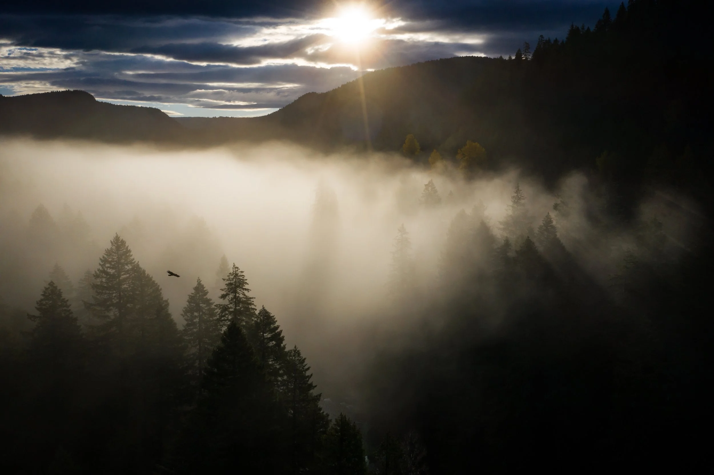 One early Autumn morning, I ventured deep into the forest near my home in the Columbia River Gorge. Thick fog was rising from the river, enveloping the evergreens & amber trees, while an early bird was out to catch its worm.